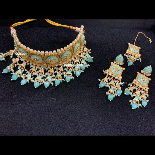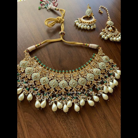 Mint green meenakari Kundan choker necklace with earrings and tikka