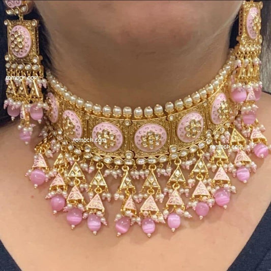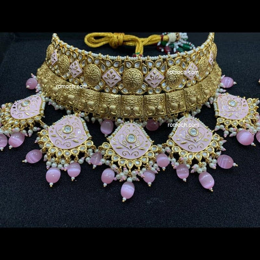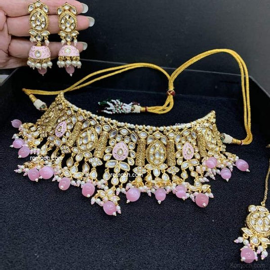 Pink meenakari Kundan choker necklace with earrings and tikka